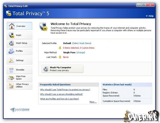 Total Privacy - специалист по уничтожению следов деятельности пользователя на компьютере. Приложение справляется с кэшем всех популярных браузеров и может подчищать историю интернет-пейджеров MSN Messenger, AOL, ICQ и Yahoo. Вдобавок программе по силам изменить историю посещенных страниц и недавно открывавшихся документов, а также многие менее существенные и не связанные с интернет-активностью "следы". Отметим еще возможность запуска программы по расписанию или по "условному сигналу" - к примеру, по закрытию браузера.