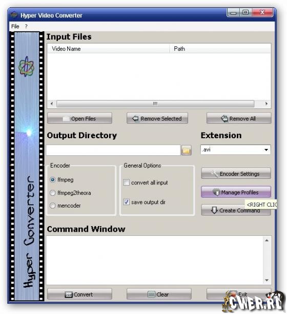 Hyper Video Converter является графической оболочкой для различных программ, работающих с конвертацией видео, таких как: ffmpeg, ffmpeg2theora и mencoder. Имеется поддержка профайлов и групповое конвертирование видеофайлов. Поддерживаемые форматы: avi, mpg, mkv, flv, mp3, ogg, ogm, mov, mvw, vob, rm, asf, 3gp, mp4.