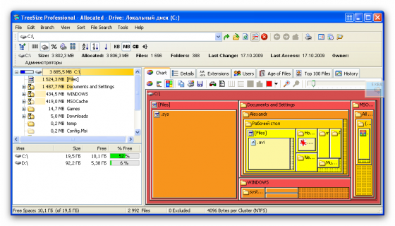 TreeSize - программа для определения занятого места на жестком диске. TreeSize позволяет найти файлы и папки, которые занимают больше всего места. Программа выдает информацию о количестве файлов в папке, дате последнего доступа, владельце файла и многое другое. Кроме этого, возможен экспорт полученных данных в Excel, HTML или ASCII файлы. TreeSize Professional поможет вам определить, куда делось свободное место. Программу можно запустить из контекстного меню папки или диска, и она покажет, сколько занимает этот объект и директории, которые в него входят. Содержимое каждой папки можно просмотреть в окне с интерфейсом Проводника, в котором количество файлов на дисках или в отдельных папках и их размер, дата последнего обращения к ним, степень NTFS компрессии и пр.