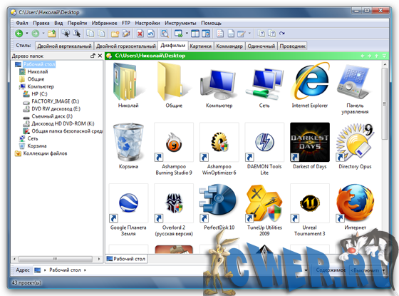 Directory Opus - мощная альтернатива Проводнику с настраиваемым интерфейсом, встроенным ftp-клиентом, внутренней поддержкой архивов, просмотром изображений, встроенным командным языком, настраиваемыми горячими клавишами для управления и очень большим числом других полезных при работе с файлами опций. Например, поиск дубликатов, безвозвратное удаление файлов, поддержка SSL и SSH/SFTP, конвертирование графики и т.д.