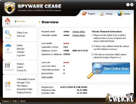 Spyware Cease - получившая множество наград, анти-троянская программа для защиты Вашего компьютера от шпионских атак, которые могут вызвать нежелательные всплывающие окна, замедлить производительность Вашего ПК или "снять" с системы какую-либо секретную информацию, без Вашего ведома, в виде паролей доступа, номеров кредитных карт и т.п.