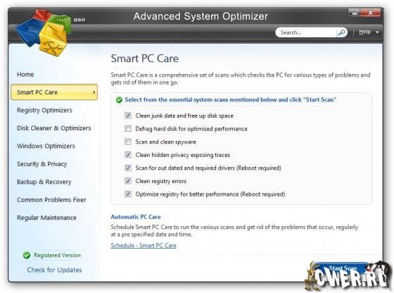Advanced System Optimizer - программное решение для настройки и оптимизации работы вашей системы. Это легкий и самый лучший способ для сохранения производительности и безошибочной работы вашей системы. Программа содержит в себе более 30 различных инструментов для улучшения производительности и скорости работы вашей операционной системы. С помощью этой программы вы сможете чистить жесткий диск от ненужных файлов и различного мусора, проделывать чистку и дефрагментацию системного реестра, удалять конфиденциальные данные (кукисы, история сайтов, кеш и любые другие следы вашей активности), а также создавать резервную копию системных файлов и, при надобности, восстанавливать их.