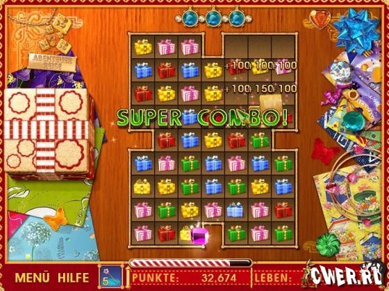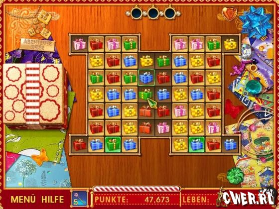 Эта игра кажется простой, но она вас не разочарует. Разноцветные подарки выглядят очень привлекательно, время летит неумолимо, и так хочется набрать побольше очков! Ваша задача состоит в том, чтобы очистить все цветные плашки на поле, соединяя поверх них по три и более одинаковых подарков. Игра порадует очень красивой графикой и приятной музыкой.