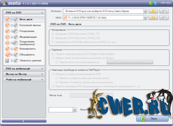 - Копировать на чистый DVD диск любого формата(DVD+R/RW, DVD-R/RW, DVD+R DL, DVD-R DL).