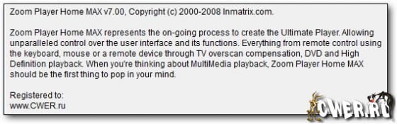 Zoom Player MAX - наиболее мощный, гибкий и настраиваемый DVD и медиа плеер для операционных систем Windows. Программа поддерживает плейлисты, управление горячими клавишами, полноэкранный режим работы, масштабирование широкоэкранного видео для удаления полос снизу и сверху экрана, несколько видов интерфейса и его изменение с помощью скинов. В данной программе реализована поддержка Quick Time и функция создания закладок. Также существует функция обратной перемотки для всех форматов. Zoom Player MAX является самой функциональной версией данной программы, ориентирована на самых требовательных пользователей и предлагает максимальную гибкость использования и настройки. В шестой версии плеера были упрощены настройки, реализована полная поддержка Windows Vista, оптимизирована интеграция с оболочкой Windows и введена масса других улучшений.