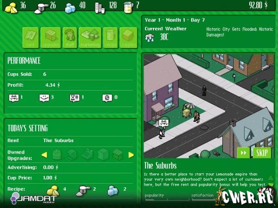 Проверьте свое мастерство предпринимателя: сможете ли вы развить маленький торговый лоток в целую бизнес-империю? Выберите подходящее место для розничной торговли прохладительными напитками, изобретите лучший рецепт лимонада и установите цену, а также не забудьте просмотреть последний прогноз погоды. Например, если жарит солнце, а в городе проводятся соревнования по сёрфингу, то самое время катить тележку на пляж, где соберётся куча умирающего от жажды народа. Если же с утра зарядил мерзкий противный дождик, то можно поискать счастья возле супермаркета или в центре города, на пляже точно ничего не заработаете.