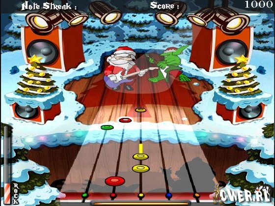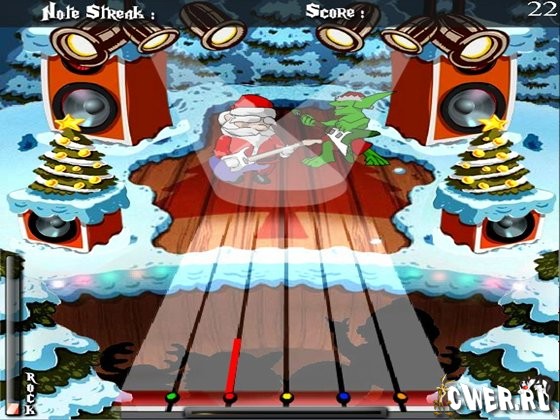 Помогите сыграть Санте на гитаре рок музыку под овации аплодисментов. Помощь заключается в том, что Вам необходимо вовремя нажимать клавиши от 1 до 5 при приближении фишек.