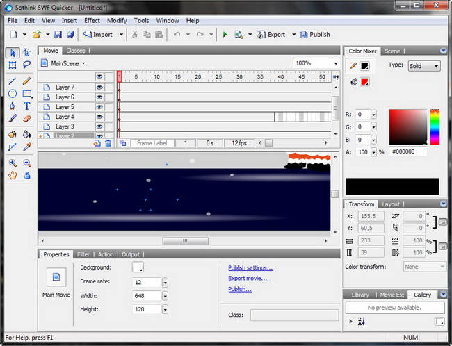 Sothink SWF Quicker - мощное приложение для редактирования и создания Flash роликов в формате SWF для вебсайтов. С помощью этой программы вы сможете создавать флэш-игры, ролики, анимационные динамические баннеры для ваших сайтов, текстовые эффекты, веб-альбомы, слайдшоу презентации и многое другое. Для новичков программа предлагает быстрое создание флэш-анимации с помощью Мастера создания нового проекта с выбором типа и шаблона для вашего проекта.