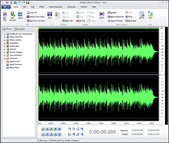 - Применение различных эффектов (Amplify, Delay, Equalizer, Fade, Flanger, Invert, Normalize, Reverse, Multi Tap Delay, Silence, Stretch, Vibrato, Echo, Chorus)