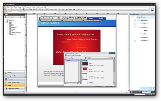 Разработчиком была предусмотрена возможность свободного размещения текстовых и графических элементов в рамках странички, а также реализовано наличие интегрированного графического редактора, при помощи которого можно работать с растровыми и векторными изображениями, применяя к ним имеющиеся фильтры и эффекты. Более того, присутствует богатая библиотека готовых шаблонов, которые успешно могут быть использованы в качестве основы будущего проекта.