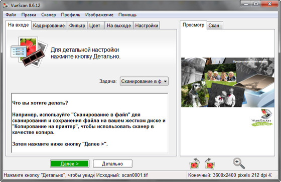 VueScan Pro - программа для работы со сканерами HP, Minolta, Nikon, Polaroid, Epson, Canon и другими. Может работать с внутренней глубиной цвета. VueScan поддерживает автоматическую и ручную настройку большинства параметров и пакетный режим сканирования. Поддерживается более 500 моделей сканеров с определенным перевесом в сторону слайд-сканеров — Nikon, Minolta, Polaroid, Microtek, Epson. Предусмотрено автоматическое удаление дефектов изображения за счет канала инфракрасного сканирования и многопроходное сканирование с последующим усреднением результата — для подавления собственных шумов сканера. Имеются фильтры подавления зерна, нерезкого маскирования и удаления паразитного оттенка оригинала. Есть средства ручной корректировки динамического диапазона и градационной характеристики (независимо по каналам R, G, B).