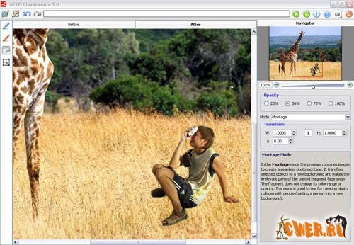 AKVIS Chameleon - программа (плагин) для Photoshop для тех, кто любит создавать коллажи и удивительные художественные композиции. Chameleon бережет ваше время и силы, так как не требует точного выделения объектов и тщательной обработки границ между вставкой и фоном. Именно поэтому программа получила такое название - она "хамелеонит", приспосабливает цвета.