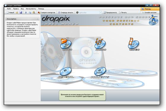 Droppix Label Maker - это замечательная программа для создания и печати высококачественных наклеек для дисков CD и DVD. Для создания наклеек Droppix Label Maker имеет профессиональные инструменты редактирования и большое количество шаблонов, изображений и шрифтов, которые можно использовать в дизайне этикеток. Программа работает как с технологией LightScribe (нанесение монохромных рисунков на поверхность диска), так и с любыми принтерами, которые печатают на CD/DVD.