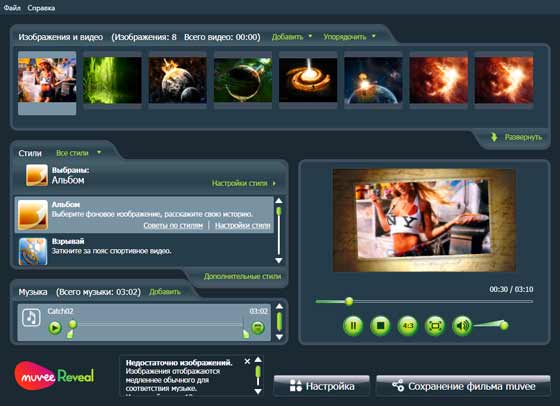 Muvee Reveal - позволяет быстро и легко создавать фильмы и слайд-шоу из фотографий и видео. Нужен тем, кто не привык заморачиваться тонкостями видеомонтажа. Просто добавьте видео, изображения, любимую музыку и выберите предварительно созданный стиль, все остальное программа сделает сама.