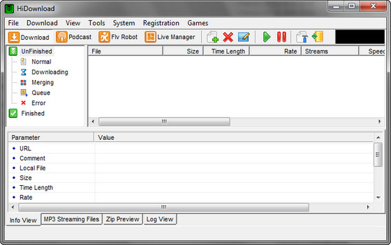 HiDownload - менеджер загрузок. Поддерживает работу по протоколам HTTP, FTP, RTSP (Windows Media), PNM, MMST и MMSU (это значит, что потоковое аудио - RA, RM и Apple Quicktime Streaming - можно "скачать" без проблем). Может работать через прокси, позволяет просматривать архивы и скачивать из них только необходимые файлы, позволяет сохранять Flash, имеется встроенный поиск MP3-файлов. Кстати говоря, есть у этой программы и внутренний поиск.