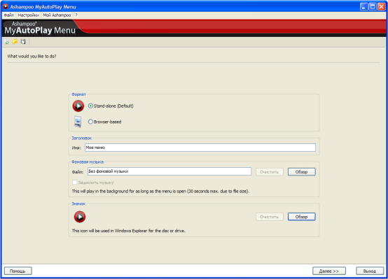 Часто, когда Вы вставляете коммерческий диск, он автоматически запускается с графического меню, позволяющего Вам делать выбор: установка программы, показ веб-страницы, просмотр документации или информационного материала и так далее. Создание таких дисков и меню вручную - является довольно большой работой и требует программных навыков – и даже если у Вас есть навыки, потребуется много времени. С помощью Ashampoo MyAutoPlay Menu любой сможет сделать такой диск без особого труда. Программа поддерживает прожиг CD и DVD для того, чтобы Вы могли сразу записать созданные диски.