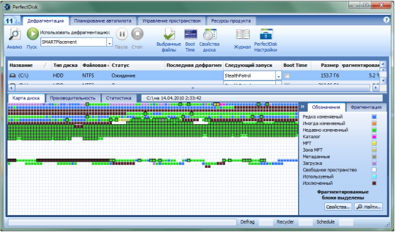 Данные в этой таблице отображаются в виде разноцветных квадратиков, расшифровку цвета которых можно посмотреть в главном окне PerfectDisk. Стоит отметить довольно быструю работу утилиты. Это связано с тем, что используется однопроходный метод дефрагментации с учётом S.M.A.R.T. данных винчестера. Может дефрагментировать не только локальные диски, но и с сетевые, причем в этом случае для облегчения настройки заданий используются профили сетевого планирования дефрагментации и полностью настраиваемое протоколирование работы. Поддерживаются работа с RAID-томами.