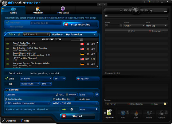 RadioTracker - программа использующая около 15.000 интернет-радио станций для прослушивания и записи музыки в формате mp3. Возможности программы довольно велики: поиск музыки, разбивка на разные жанры (Dance/House, Pop, Rap, Rock, Techno, Metal, Jazz, 80s, 70s и т.д.), во время сохранения треков сохраняется и вся информация об исполнителе и другая полезная информация, возможность использования фильтров удаления рекламы и прочего мусора на радио. Программу Radiotracker обслуживает база данных, в которой хранятся файлы восьми тысяч онлайн-радиостанций со всего мира. Больше, по сути, и не нужно, потому что здесь представлены радиостанции буквально на любой музыкальный вкус.