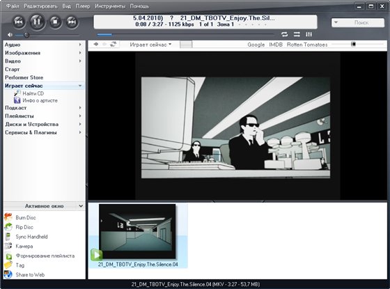 J.River Media Center - мультимедийный центр. Проигрывает большинство популярных аудио и видео форматов, включая MP3, аудио CD и DVD, может преобразовывать CD-аудиотреки в WAV и MP3, переписывать на жесткий диск виниловые диски и кассеты, а также создавать аудио-CD, причем для всех этих функций программа имеет множество настраиваемых параметров. Кроме этого, есть очень хороший и мощный по своим возможностям органайзер мультимедийных файлов, медиаредактор, эквалайзер, встроенный DSP и удобный планировщик заданий для автоматизации процессов проигрывания/записи, а также поддержка пульта ДУ. Из необязательных, но приятных функций - становящаяся уже почти стандартом для "приличных" программ возможность изменения внешнего вида с помощью скинов, мини-режим проигрывателя и "телевизор".