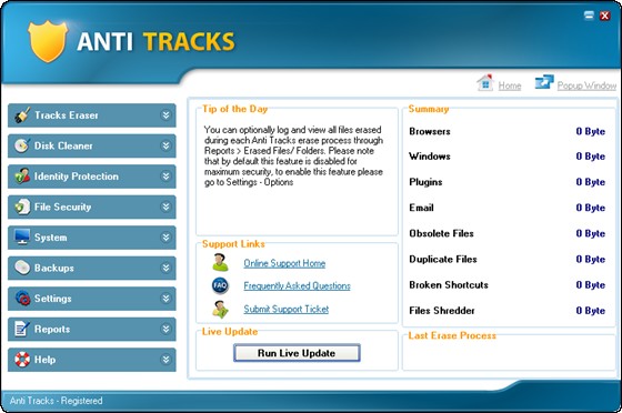 Anti Tracks is a complete solution to protect your privacy and enhance your PC performance. With a simple click Anti Tracks securely erase your internet tracks, computer activities and programs history information stored in many hidden files on your computer. Anti Tracks support Internet Explorer, AOL, Netscape, Mozilla FireFox and Opera browsers. It also include more than 100 free plug-ins to extend erasing features to support popular programs such as ACDSee, Acrobat Reader, KaZaA, PowerDVD, WinZip, iMesh, Winamp and much more.