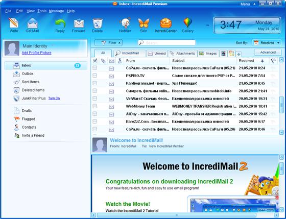 Внешний вид программы тоже необычный - веселый и красочный, к тому же он поддается изменению с помощью скинов; необычно и то, что в программе использован речевой синтезатор, сообщающий о приходе почты и других событиях. В остальном же IncrediMail - качественный почтовый клиент, поддерживающий работу с несколькими почтовыми ящиками, с возможностью предпросмотра писем прямо на сервере и удалением тех из них, что не нужны, с удобной системой сортировки писем за счет создания правил их обработки и со всеми другими атрибутами, присущими современным почтовым программам, включая поддержку безопасного включая поддержку SSL-соединения. Естественно, отправлять письма можно не только в HTML, но и в текстовом формате, а также в виде звукового письма.