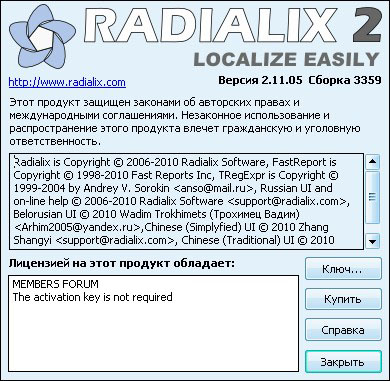 Radialix - профессиональный инструмент для локализации (перевод интерфейса на иной язык приложений, в том числе созданных с использованием VCL. Продукт поддерживает технологию памяти переводов и позволяет выполнять автоперевод с поиском неточного (Fuzzy) соответствия. Визуальные редакторы диалогов, форм и меню, автоопределение типа компилятора, типа ресурсов и предков классов VCL, симулятор перевода и отладчик упрощают процесс локализации. Поддерживается локализация строк в коде приложения.