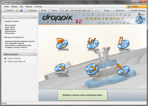 Droppix Recorder XE - великолепный комплекс программ для создания собственных CD/DVD/BD дисков, с отличной поддержкой аудио, приличной программой записи дисков и мощными инструментами для резервного копирования информации. Даже если вы не имеете достаточной подготовки, все равно работа с Droppix не вызовет у вас ни затруднений, ни разочарования! Программа поддерживает многосеансовый и смешанный режимы записи: HFS, ISO/HFS, UDF, PSX, OFAS (оптимальная скорость доступа к файлам), track-at-once (TAO) и disc-at-once (DAO) и многое другое. Так же программа умеет копировать диски с музыкой, видео файлами и другое. Поддерживает конвертирование между разными форматами.