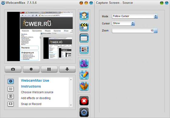 WebCamMax - продвинутая утилита для работы с веб-камерой. Программа, добавляющая изумительные видеоэффекты на все вебкамеры, даже без реальной камеры. Программу можно использовать по умолчанию в таких приложениях, как ICQ, AIM, MSN, Camfrog, Skype, Paltalk, Yahoo, ANYwebcam, Stickam. Можно настроить WebcamMax Full так, чтобы она начинала функционировать и вести трансляцию с камеры только в том случае, когда объектив зафиксирует движение.