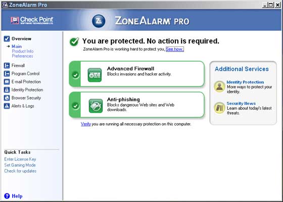 ZoneAlarm Pro - хорошо известный фаервол, предназначен для защиты компьютера от разного рода угроз при работе в интернете и локальных сетях. Программа обеспечивает отличную защиту по принципу межсетевого экрана, вплоть до возможности полного отключения всей сетевой и Интернет активности.