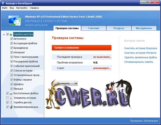 AusLogics BoostSpeed - единственная программа, которая позволит вам быстро и качественно произвести настройку вашей системы на максимальную производительность. Встроенный System Adviser проверит настройки вашей системы с помощью 50 различных тестов и предложит вам рекомендации по каждому тесту. Программа в реальном времени проверяет вашу систему и если находит, что какой-то из параметров можно оптимизировать, то обязательно проинформирует вас.