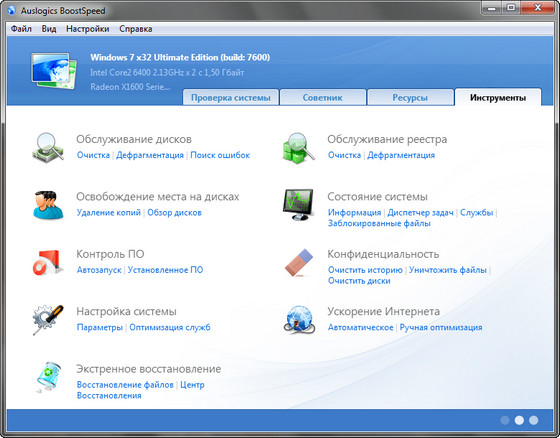 AusLogics BoostSpeed - популярная утилита для ускорения работы системы Windows, программ и Интернет-соединения от компании AusLogics. Программа оптимизирует компьютерную память, ускоряет загрузку Windows, повышает быстродействие Microsoft Office, The Bat, FireFox, Opera, Skype, чистит реестр и диск компьютера. Четвертая версия программы включает в себя знаменитый Auslogics Disk Defrag и набор новых утилит для современных компьютеров. После дефрагментации реестра BoostSpeed, скорость компьютера возрастет за счет уменьшения фрагментации файлов реестра, уменьшения их размера, а также благодаря устранению ошибок в реестре. Помимо этого данная программа предлагает мощные возможности очистки реестра и диска, что в свою очередь позволит вашему компьютеру работать более быстро и эффективно. Имеет приятный пользовательский интерфейс и поддержку русского языка