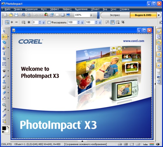 Corel PhotoImpact X3 - пакет программ профессионального уровня для работы с графикой. Поддерживает более сорока графических форматов, есть средства для создания 3D-изображений и готовые заготовки для создания веб-графики; имеются инструменты для работы со слоями, всевозможные фильтры и эффекты, возможна оптимизация изображения при сохранении в одном из web-форматов и многое другое.