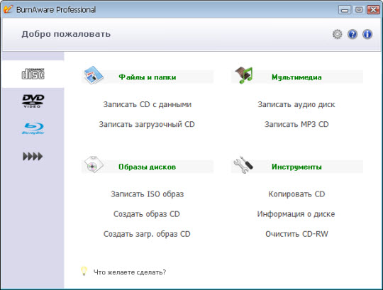 - Запись с любых типов носителей CD/DVD, а также Blu-Ray (BD-R/BD-RE)