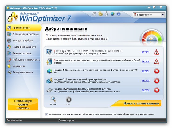 Ashampoo WinOptimizer - новая 7ая линейка пакета программ, позволяющего оптимизировать операционную систему за счет ее настройки и очистки. Включает в себя утилиты для очистки жесткого диска и системного реестра, модуль для обеспечения защиты личной информации путем поиска и удаления файлов и данных, оставшихся после интернет-cepфингa, утилиту для оптимизации интернет-соединения, модуль для настройки программ, автозагружаемых одновременно с запуском системы, а также модули для поиска и удаления ненужных фaйлoв DLL, для безвозвратного удаления данных и для шифрования файлов. Кроме этого, программа позволяет переназначать ассоциации файлов, шифровать и расшифровывать файлы, а также безвозвратно их удалять. Наконец, возможна настройка параметров системы и ее оптимизация за один клик. В шестой версии программы появилось немало новых возможностей, новые модули, включая новый антишпионский модуль и менеджер контекстного меню Windows, а также множество улучшений и исправлений.