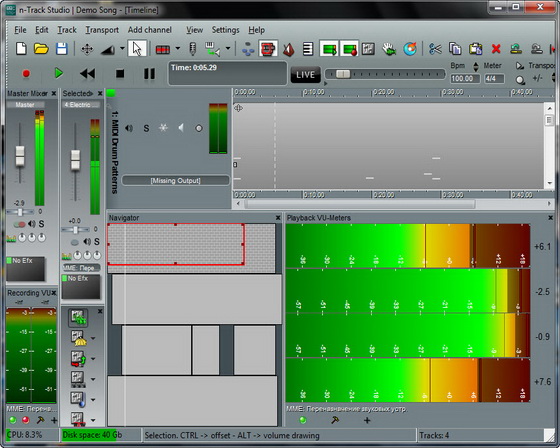 n-Track Studio - полнофункциональная многотрековая аудиостудия, позволяющая создавать свои собственные музыкальные композиции профессионального качества. Программа работает с большинством аудиоформатов, позволяет накладывать всевозможные эффекты на каждый трек с прослушиванием в реальном режиме времени, работать с каналами, исправлять синхронизацию и т.п. Кроме таких стандартных эффектов, как Reverb, Compression, EQ, Echo, Auto volume, Pitch Shift и Chorus, программа позволяет использовать DirectX и VST 2.0 плагины от сторонних разработчиков.