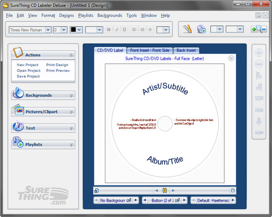 SureThing CD/DVD Labeler - это практически профессиональная среда для разработки наклеек и обложек компакт-дисков. Программа уже располагает несколькими шаблонами для оформления CD. Чтобы оформить диск, используя заготовки, нужно просто запустить соответствующий мастер. Вы также с легкостью можете создать новые варианты оформления, используя имеющиеся у вас рисунки. Для того, чтобы вам не пришлось вручную заполнять поля с именами артистов и названиями треков, CD Labeler позволяет импортировать информацию из тега MP3-файла.
