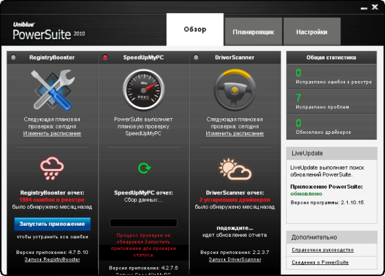 Uniblue PowerSuite 2010 - является полным решением для повышения производительности компьютера. Слияние RegistryBooster, DriverScanner и SpeedUpMyPC в рамках единого интерфейса, PowerSuite повышает и защиту уязвимых групп, но очень важных элементов системы привязаны к скорости и стабильности.