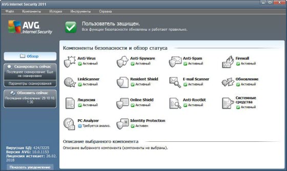 AVG Internet Security - мощный пакет приложений компании GrisоfТ для защиты компьютера от всевозможных сетевых угроз: вирусов, троянов, червей, шпионского и рекламного обеспечений, хакеров и спама. В AVG Internet Security входят модули: Anti-Virus, Anti-Spyware, Anti-Spam и Firewall. Программа легка в использовании, имеет функцию автоматического обновления через Интернет и работы по расписанию. Программа AVG Internet Security 2011 имеет несколько уровней защиты, которые обеспечивают безопасность при совершении покупок, работе с интернет-банком, общении в социальных сетях и просмотре веб-страниц.