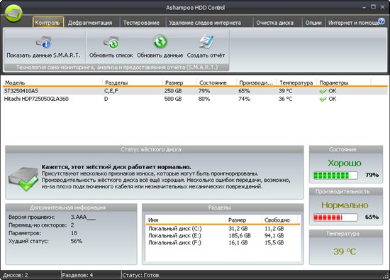 Ashampoo HDD Control - программное обеспечение для контроля за состоянием Вашего жесткого диска. Выполняет обслуживание жесткого диска для Вас. Позволяет предотвратить потенциальные отказы и аварии прежде, чем они произойдут. Программное обеспечение поддерживает жёсткие диски типа IDE и последовательные ATA. Ashampoo HDD Control предоставляет пользователю все важные факты и информацию о дисководе, включая регистрационный номер, версию БИОСА (прошивки), размер кэша, количество разделов, на которые разбит хард, свободном месте на диске и текущей температуре.