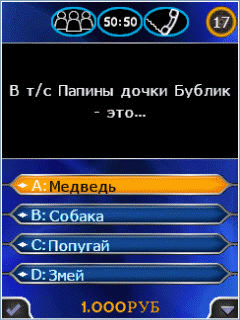 Известная викторина возвращается! С отличной графикой и великолепным звуком, эта игра никогда не была такой реалистичной, как в телевизоре. Станьте лучшим и выиграйте виртуальные миллионы! Размер экрана: 240×320.