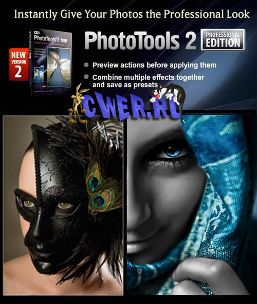 PhotoTools is the fastest way to add a professional look to your photos in Photoshop. You get hundreds of professional-grade photographic effects designed by Jack Davis, Kevin Kubota and onOne Software, all wrapped up in an easy-to-use Photoshop plug-in making this the fastest and easiest way to make your photos stand out from the crowd. With PhotoTools 2, you can preview, stack and combine effects to produce professional grade results in just a few clicks. PhotoTools 2 reproduces camera filters like neutral density, color correction and polarization as well as film and darkroom techniques such as paper toners and alternative processes. You can even simulate the look of different films with a wide range of grain and contrast effects. You can also save an effects "recipe" as a preset and use it not only with Photoshop, but also with Lightroom 2 and Aperture 2.1. Whether you are a professional photographer or an amateur, your workflow just got a lot easier with PhotoTools 2.
