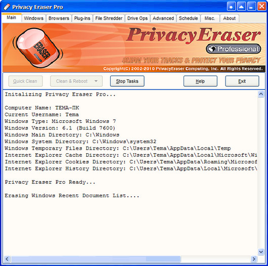 Privacy Eraser Pro - программа для очистки следов пребывания в интернете для таких браузеров: Internet Explorer, Mozilla Firefox, Google Chrome, AOL, Opera and MSN Explorer. А также поддерживает более 250 плагинов для очистки следов приложений, таких как: ACDSee, Acrobat, Microsoft Office, KaZaA, Real Player, Media Player и т.д.