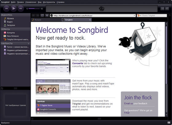 Songbird - aудиоплеер, основанный на движке популярного браузера Firefox. Ориентирован на воспроизведение музыкальных файлов не только с жесткого диска, но и из сети. По замыслу разработчиков, Songbird - это не столько аудиоплеер, сколько музыкальный веб-браузер... Songbird умеет работать с разнообразными форматами музыкальных файлов и музыкальными сервисами. Имеется возможность создания мультимедийной библиотеки, которая поможет организовать все музыкальные файлы компьютера в единый архив, при этом в нее можно включать и композиции, находящиеся в активных сетевых плейлистах.
