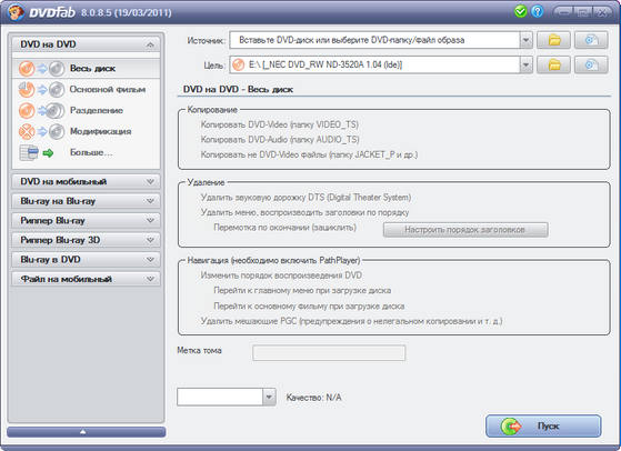 - Копировать на чистый DVD диск любого формата(DVD+R/RW, DVD-R/RW, DVD+R DL, DVD-R DL).