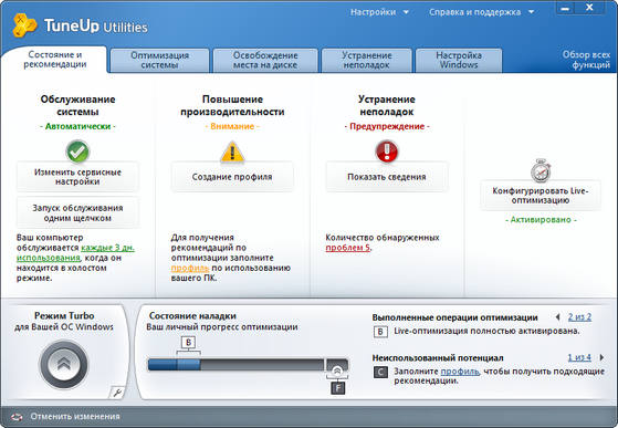 TuneUp Utilities предлагают Вам два новых метода оптимизации, которые гарантируют оптимальную работоспособность даже при высокой загруженности компьютера. В случае необходимости, быстродействие будет увеличено или ускорится процесс запуска программы.