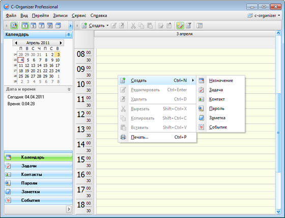 C-Organizer Professional - красивый и мощный персональный информационный менеджер. Эта программа поможет Вам организовать и спланировать Вашу работу и личную жизнь. Это планировщик, адресная книга, менеджер паролей и закладок, записная книжка и календарь событий, объединенные в одну мощную и удобную программу.