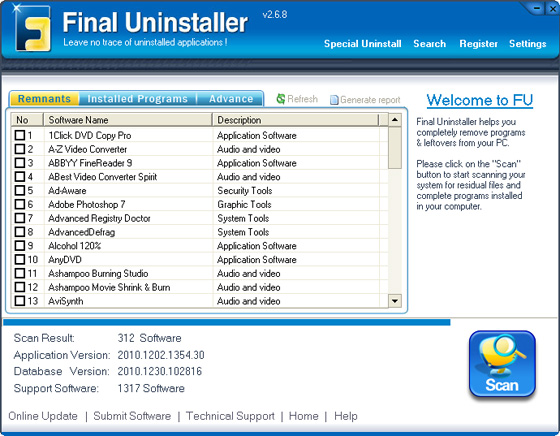Final Uninstaller - программа позволяет очищать жесткий диск и системный реестр от мусора, оставшегося после удаления каких-либо программ. Программа использует высокоэффективный алгоритм обнаружения, который позволяет быстро просканировать систему и найти ненужные файлы и записи в системном реестре для каждой установленной программы на вашем компьютере. За несколько щелчков мыши программа просканирует ваш жесткий диск и реестр Windows, после чего предоставит вам список приложений, которые были неправильно деинсталлированы. После чего вы сможете выбрать приложения для последующего их полного удаления с компьютера. Программа имеет понятный пользовательский интерфейс и проста в использовании, поэтому подходит для любого пользователя.