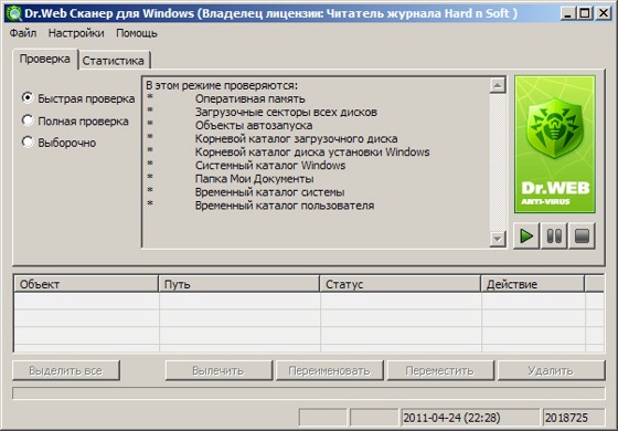 Обновился популярный сканер Dr.Web 6.0 версии для Windows, позволяющий с большой долей вероятности обнаруживать неизвестные вирусы, руткиты, троянские программы, шпионское ПО и разного рода вредоносные объекты. Программа допускает автоматическую загрузку из Интернета новых баз данных вирусов.