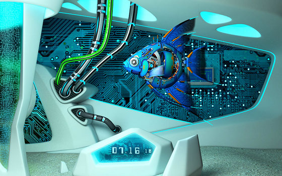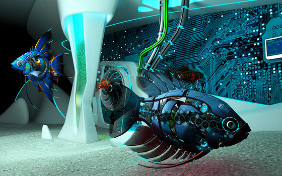 Превратите свой экран в трёхмерный аквариум в стиле sci-fi и созерцайте неторопливое плавание удивительных механических рыб среди причудливых форм будущего.