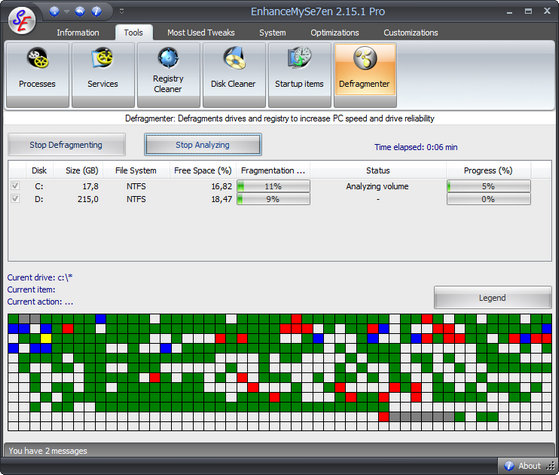 EnhanceMySe7en включает в себя менджер автозагрузки, менеджер процессов, модуль очистки жесткого диска, дефрагментатор жесткого диска, "чистильщик" системного реестра, монитор жесткого диска (температура, время работы, серийный номер и т.п.), модуль настройки интернет-соединения, а также средства для быстрого доступа к "тонким" настройкам операционной системы.
